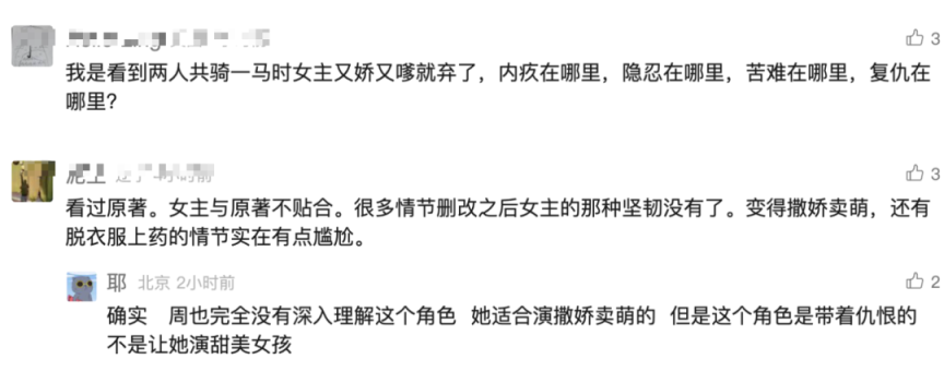 本来,原著书迷就吐槽魔改。编剧弱化了原著中女主的复仇动机,导演为了推进故事节奏,只用一集仓促交代女主过往经历,用流水账一样的旁白念出来。观众还没来得及带入女主遭遇家人背叛后的凄惨心境,未及感受情感冲击,女主已经获救重生了。